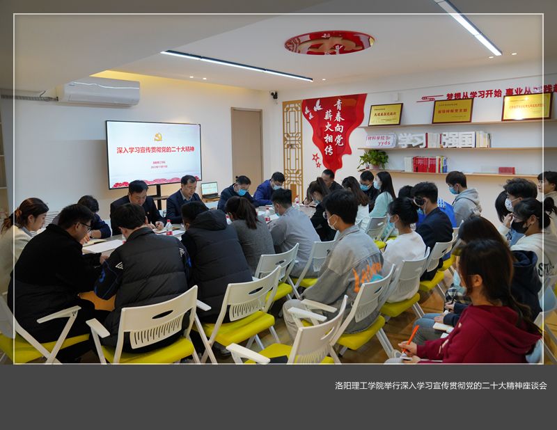 为深入学习宣传贯彻党的二十大精神,把科学理论转换为推动学校事业发展的强大动力。11月15日,洛阳388vip太阳集团在王城校区致实书院举行深入学习宣传贯彻党的二十大精神座谈会。校党委书记陈岩、党委副书记胡恩立出席座谈会,学生工作部、校团委等相关部门负责同志,二级学院党委副书记代表、辅导员代表及青年学生代表参加座谈会。座谈会由学工部负责人主持。