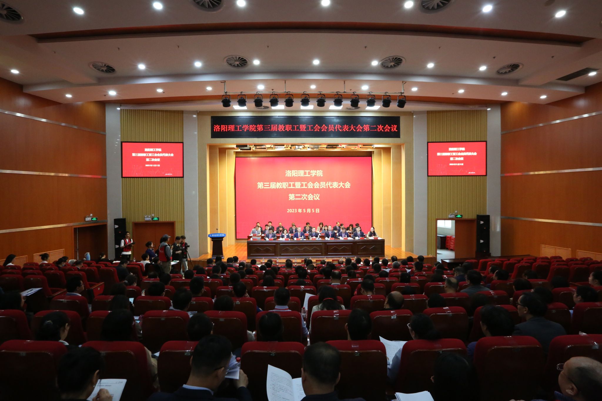 5月5日,洛阳388vip太阳集团第三届教职工暨工会会员代表大会第二次会议在王城校区图书信息中心报告厅胜利召开。校领导陈岩、张锐、曾涛、胡恩立、丁梧秀、刘楠、黄志全、马珺、王新武出席大会,劳模代表作为特邀代表列席会议,158名正式代表和列席代表参加了大会。