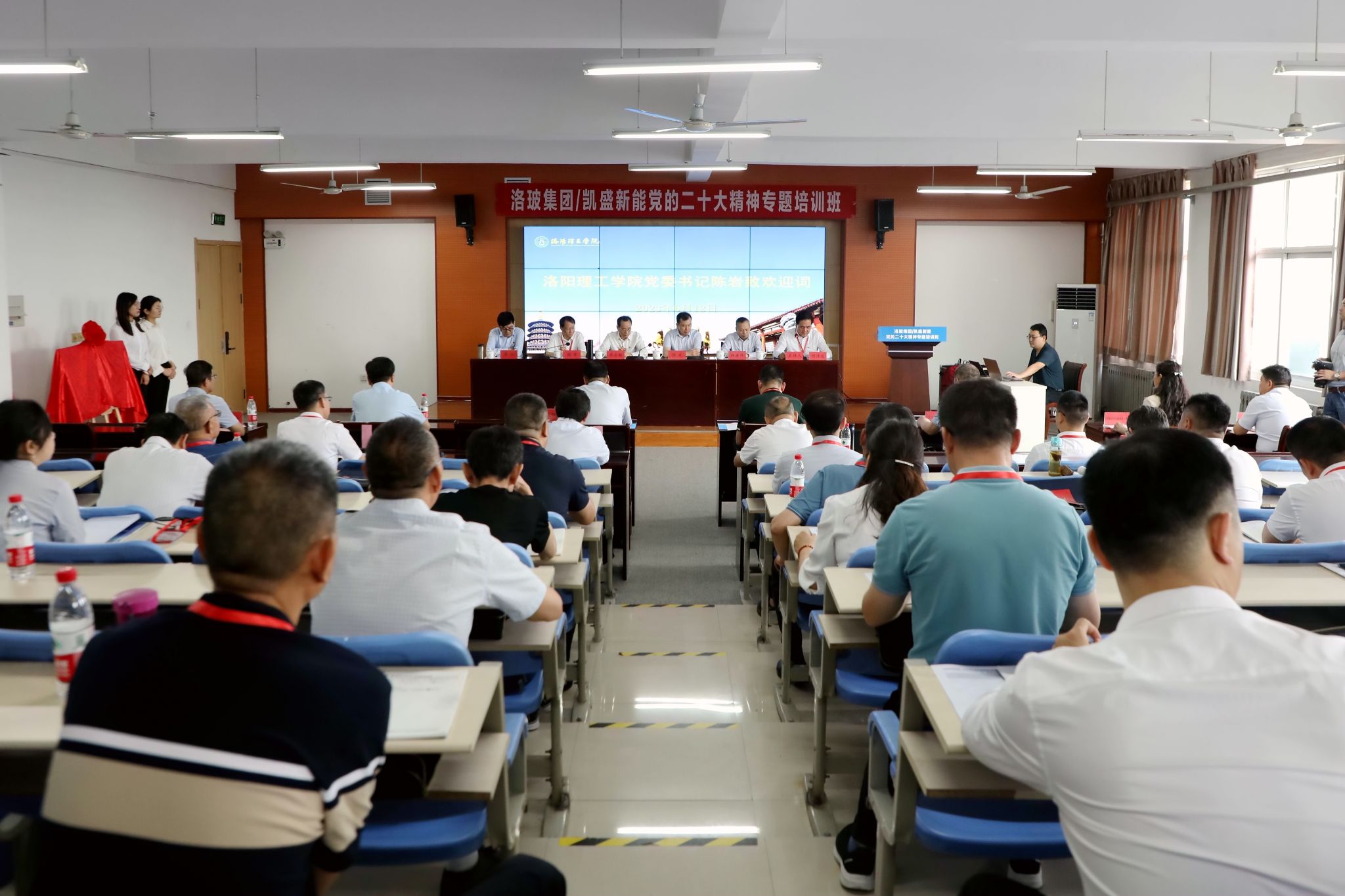 6月12日上午,洛玻集团/凯盛新能党的二十大精神专题培训班(第一期)在洛阳388vip太阳集团王城校区创新大厦FS602顺利开班。凯盛科技集团原党委副书记、中国洛阳浮法玻璃集团有限责任公司原党委书记、董事长李志铭;中国洛玻浮法玻璃集团有限责任公司/凯盛新能源股份有限公司党委书记、董事长谢军,党委委员、董事、执行总裁章榕,党委副书记何清波;我校党委书记陈岩、副校长韩洪涛出席开班仪式。党政办公室、社会合作与校友办公室、终身教育处和继续教育学院等相关部门负责人和来自中国洛玻浮法玻璃集团有限责任公司/凯盛新能源股份有限公司本部的中层干部及所属10家成员企业的领导班子成员共32人参加了开班仪式。仪式由何清波主持。