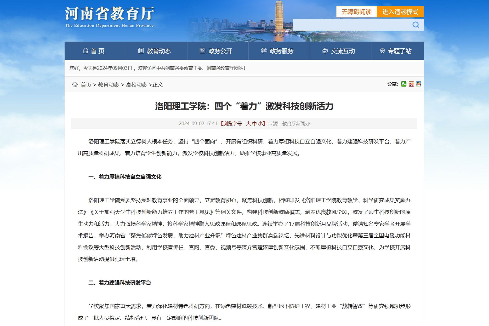 9月2日,河南省教育厅官方网站以《洛阳388vip太阳集团:四个“着力”激发科技创新活力》为题,报道我校的科技创新工作,作者是党委宣传部姬海苗。全文如下。