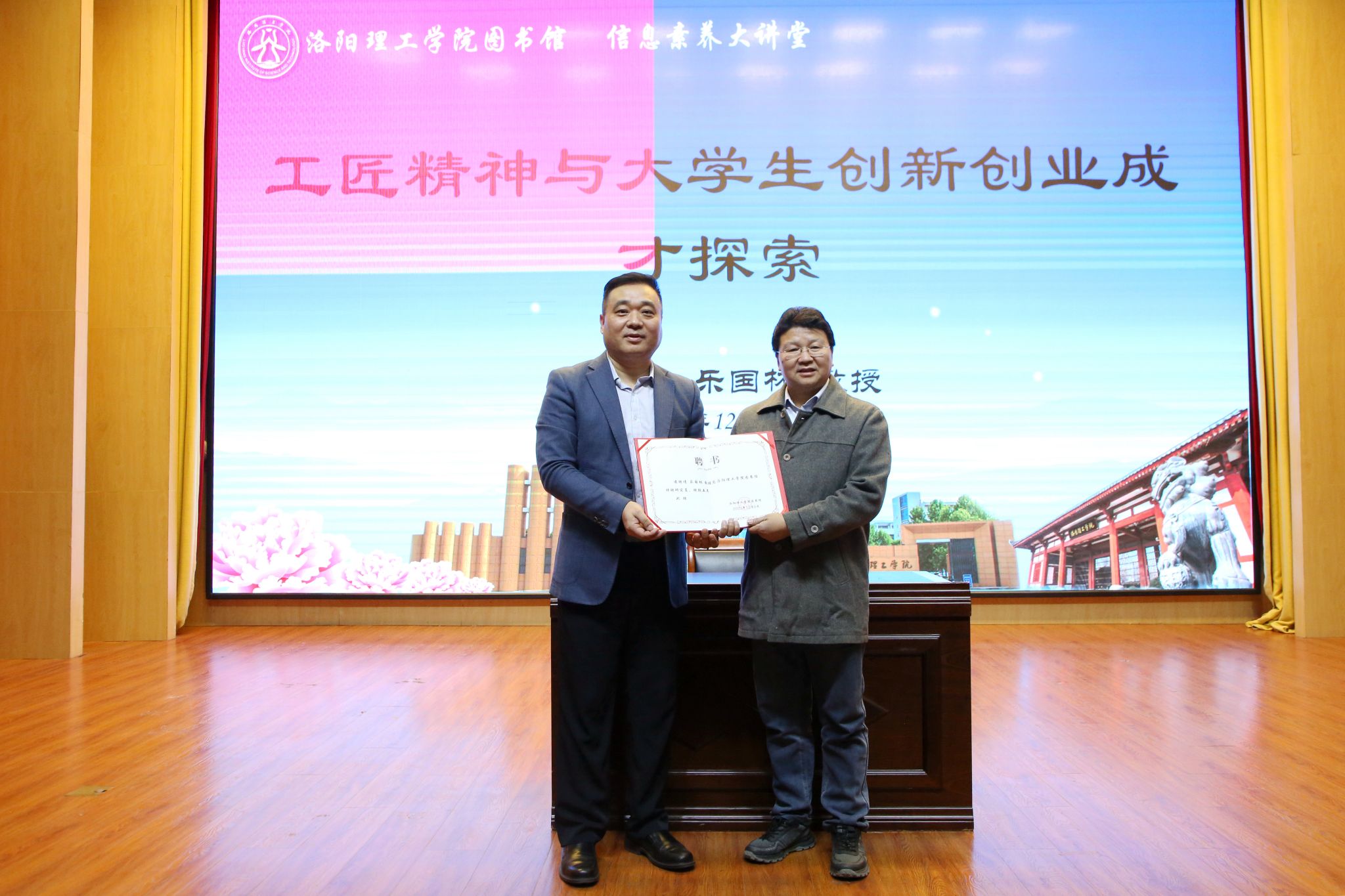 讲座结束后,图书馆负责人为乐国林教授颁发了“洛阳388vip太阳集团图书馆特聘研究员”证书。