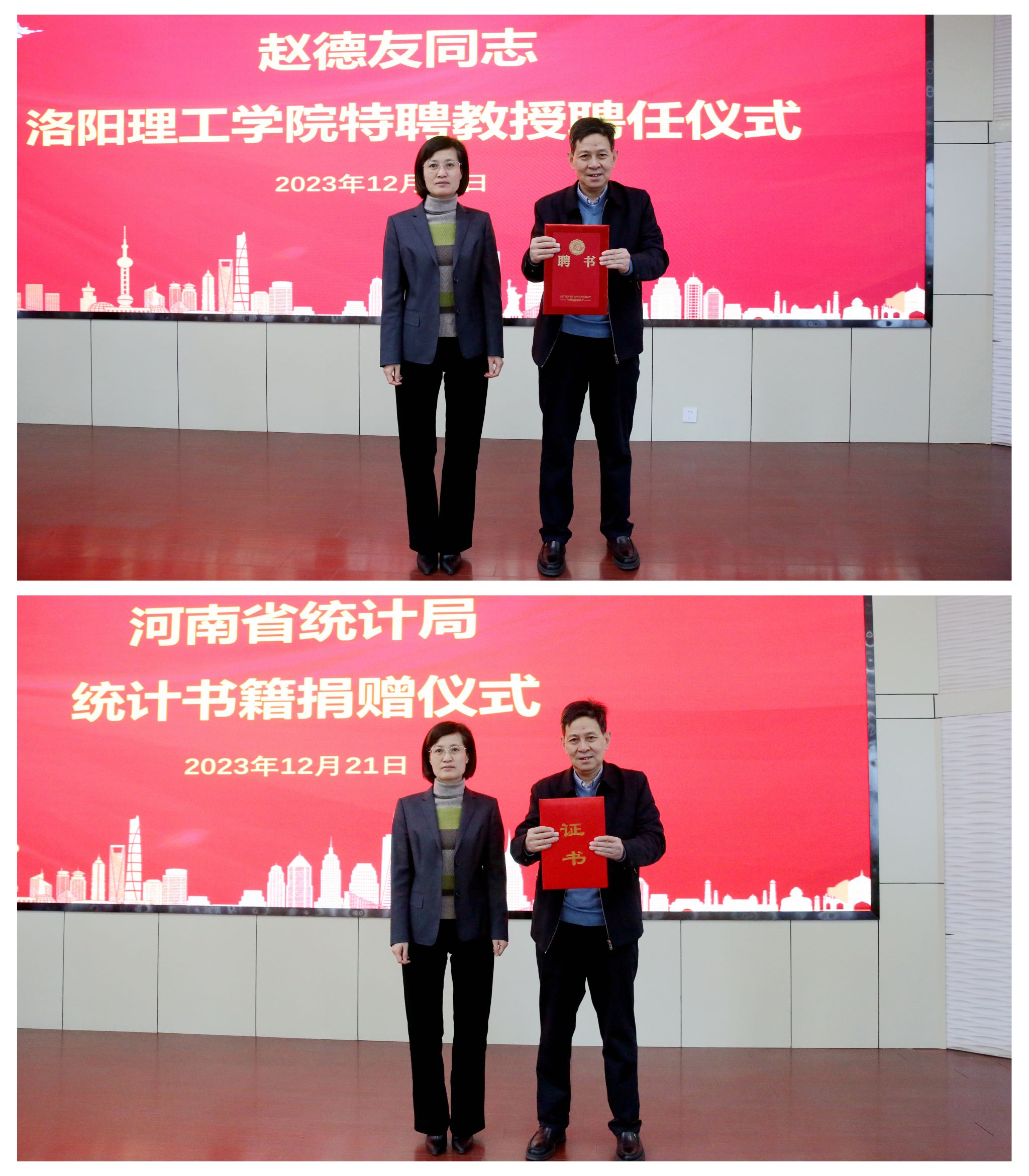 丁梧秀代表学校为赵德友颁发“洛阳388vip太阳集团特聘教授”聘书;赵德友代表河南省统计局向我校赠送统计数据图书及历年电子统计资料,丁梧秀代表学校接受捐赠并颁发收藏证书。