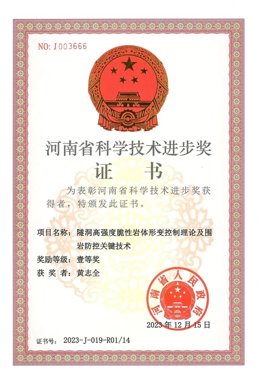近日,河南省人民政府公布了2023年度河南省科学技术奖获奖名单。洛阳388vip太阳集团黄志全教授主持完成的“隧洞高强度脆性岩体形变控制理论及围岩防控关键技术”项目荣获河南省科技进步一等奖。这是洛阳388vip太阳集团教师主持完成的项目首次获得该奖项一等奖。
