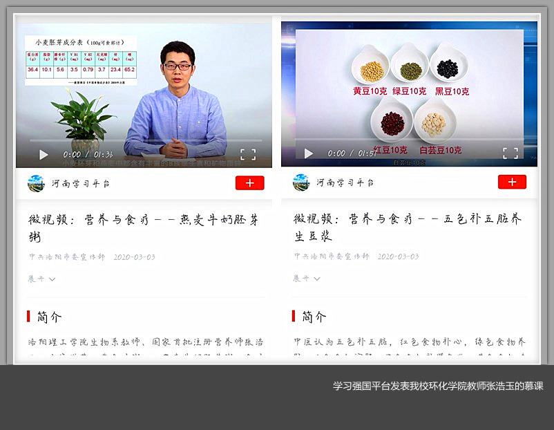 近日,学习强国平台发布我校环境工程与化学学院张浩玉老师的慕课《营养与食疗-三白蔬菜汤》等,课程共7篇。