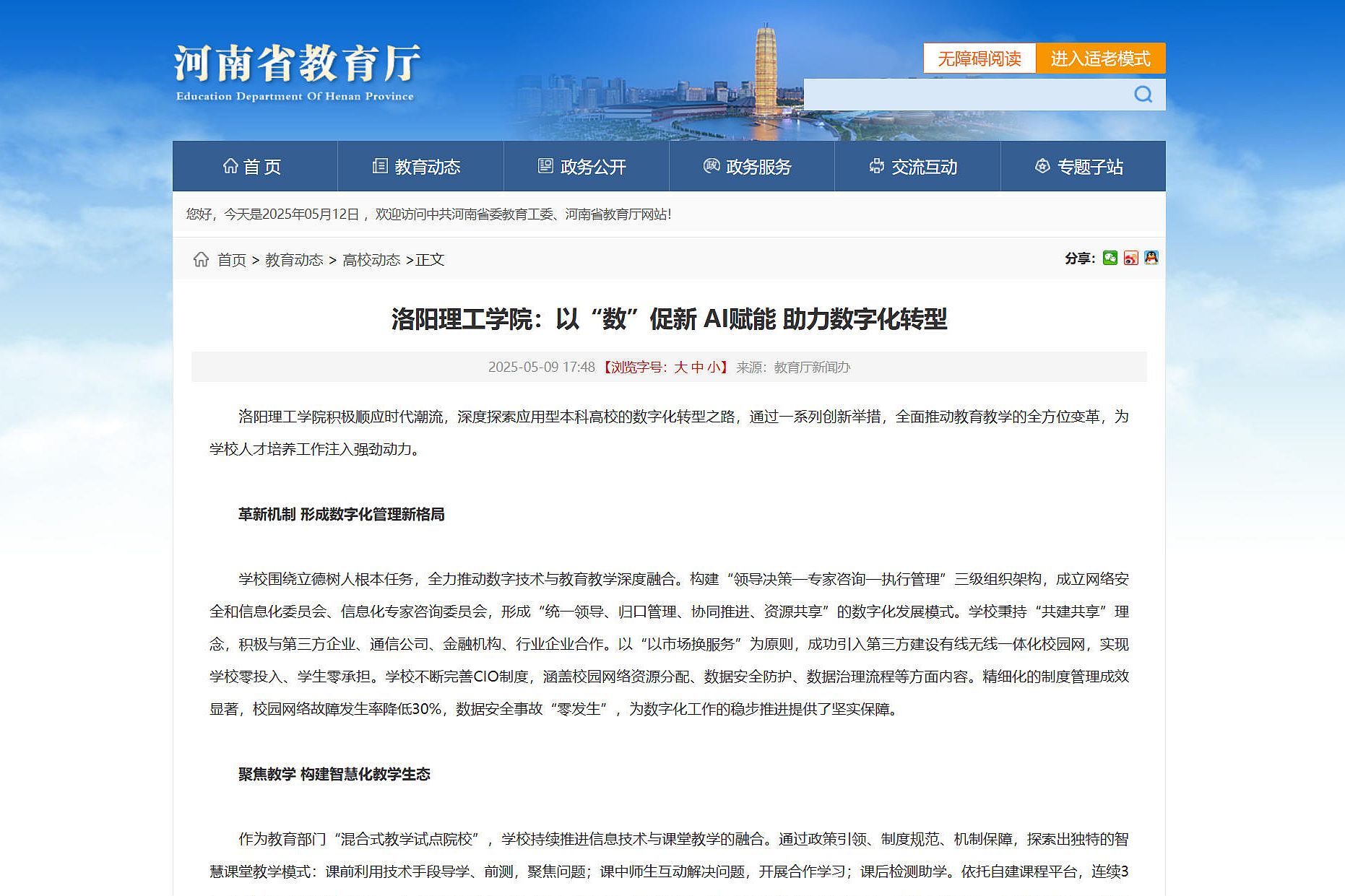 河南省教育厅,2025年5月9日,《洛阳388vip太阳集团:以“数”促新 AI赋能 助力数字化转型》