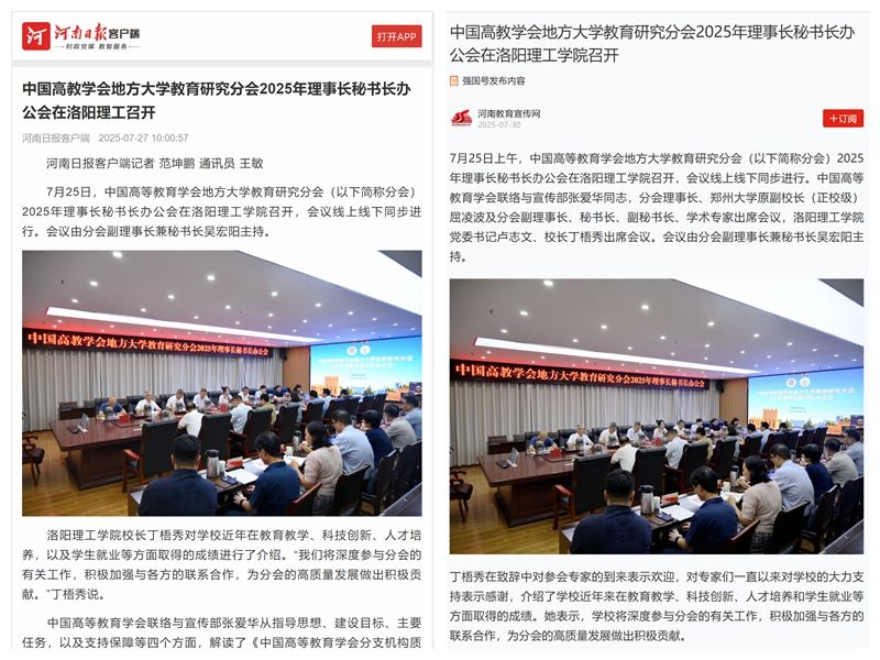 1.河南日报客户端,2025年7月27日,《中国高教学会地方大学教育研究分会2025年理事长秘书长办公会在洛阳理工召开》