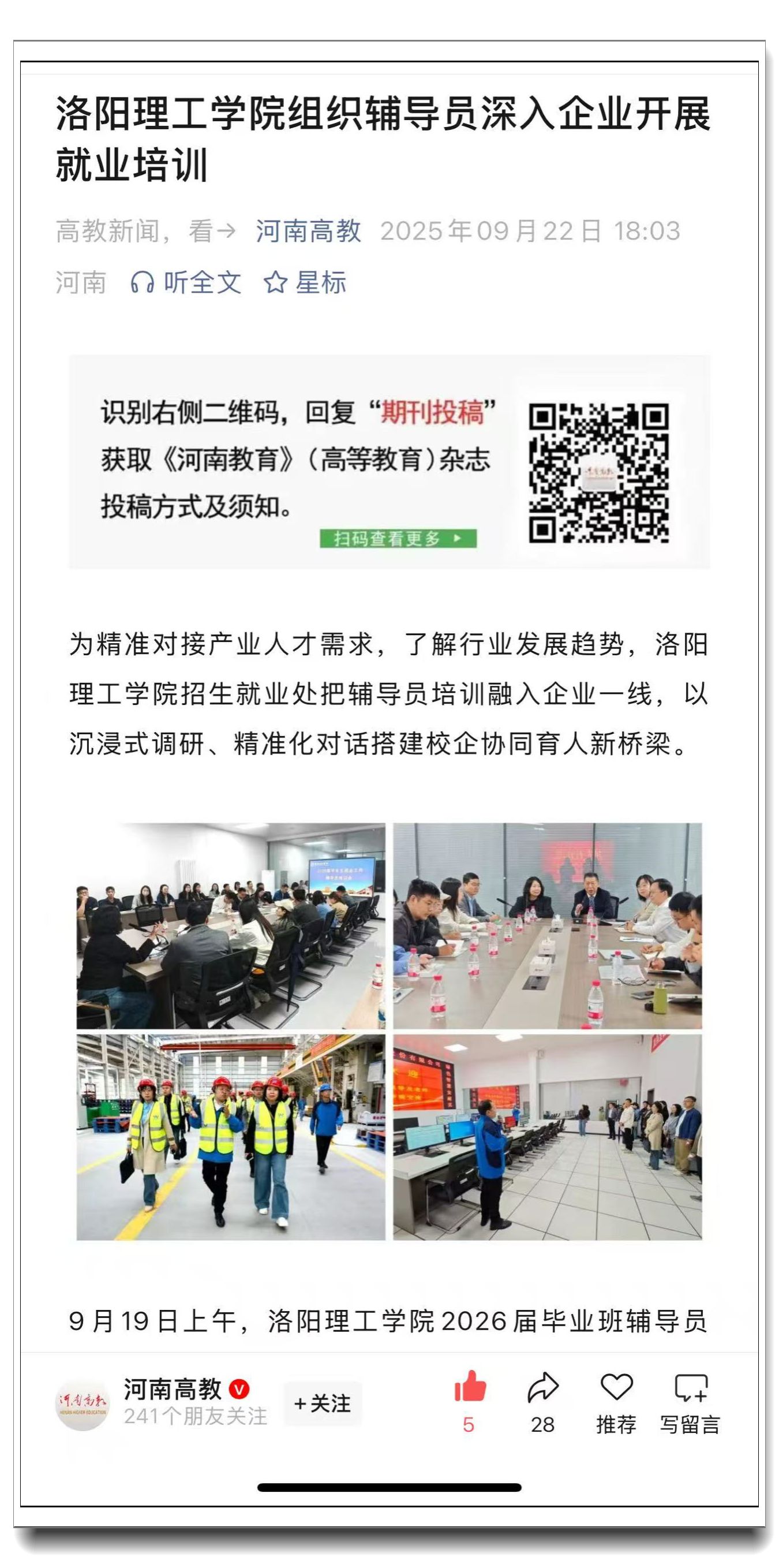 “河南高教”微信公众号,2025年9月22日,《洛阳388vip太阳集团组织辅导员深入企业开展就业培训》