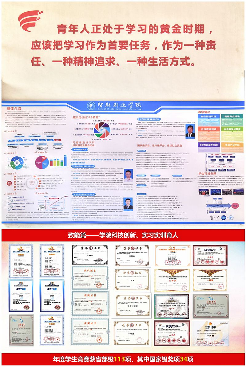 智能制造学院始终紧密围绕“立德树人”根本任务,致力于打造具有学院鲜明特色的育人环境。学院结合专业特色和学生发展特点,以致知篇、致善篇、致能篇、致新篇、协奏篇五大篇章为主线,分别从师生发展、思想引领、科创实践、心理健康、楼宇文化角度,结合楼宇门厅、荣誉墙、党员之家、心海港湾等区域,全方位展示学院文化育人成果,诠释学院特色,营造浓厚的文化育人氛围。