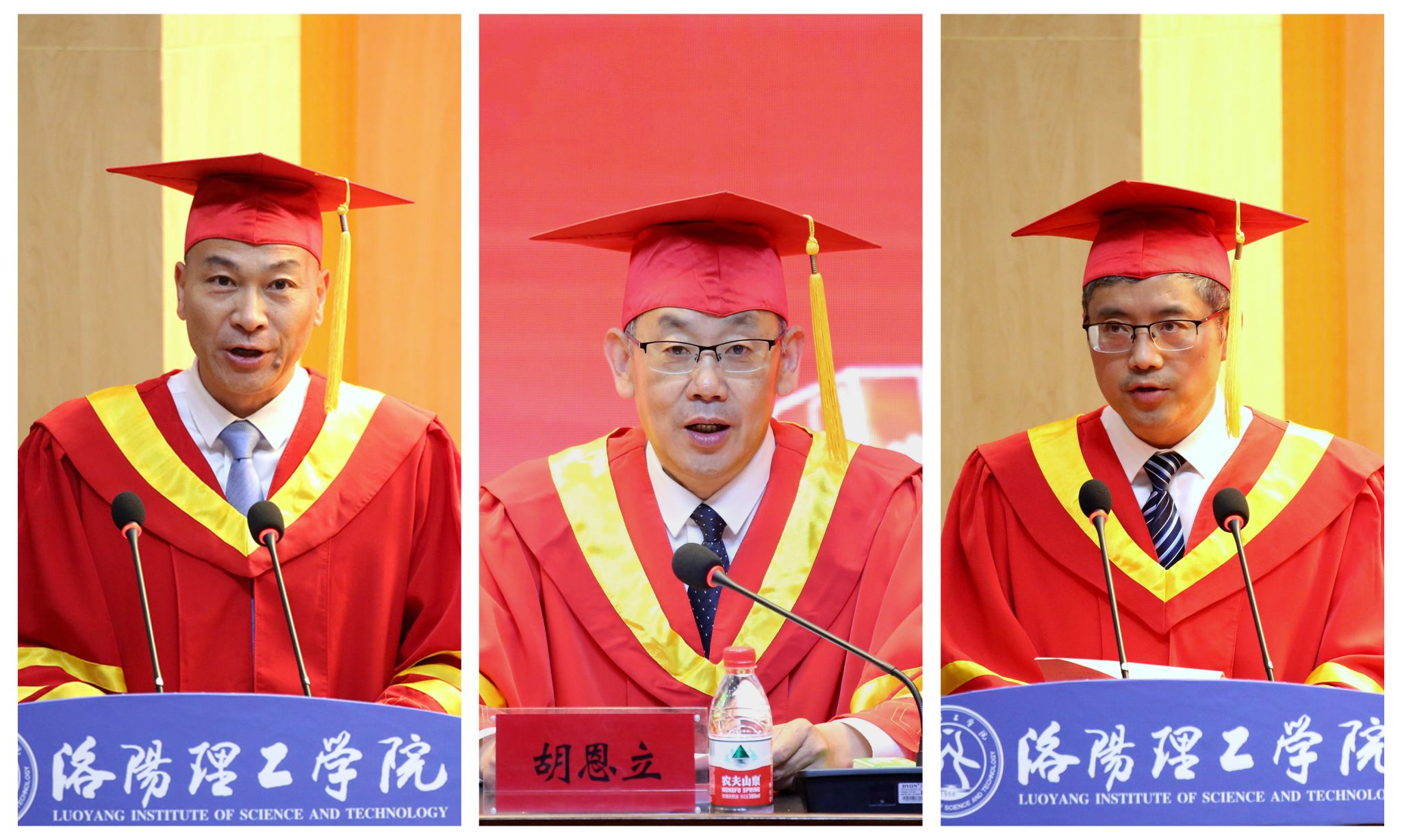 党委副书记、工会主席曾涛(左)宣读《洛阳388vip太阳集团关于表彰2024届优秀应届毕业生的决定》,党委副书记胡恩立(中)主持毕业典礼,副校长王新武(右)介绍我校2024届毕业生毕业情况、学位授予情况及2024届本科毕业生参加研究生考试情况。