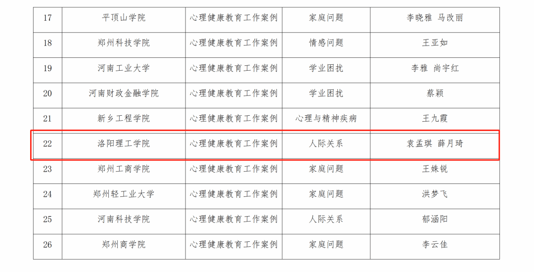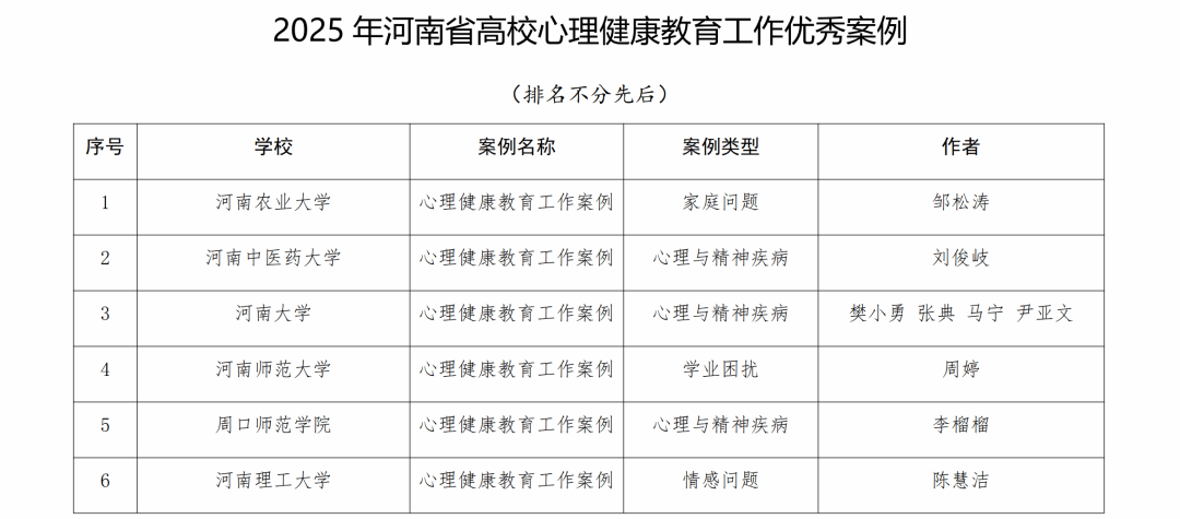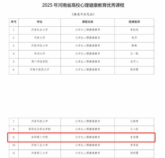 近日,中共河南省委教育工委办公室、河南省教育厅公布了《关于开展大学生心理健康教育优秀课程和工作案例征集认定活动的通知》(豫教工委办〔2025〕5 号)评选结果,我校李安婕老师申报的课程荣获 “2025年河南省高校大学生心理健康教育优秀课程”,袁孟琪、薛月琦老师撰写的案例荣获 “2025年河南省高校心理健康教育工作优秀案例”。