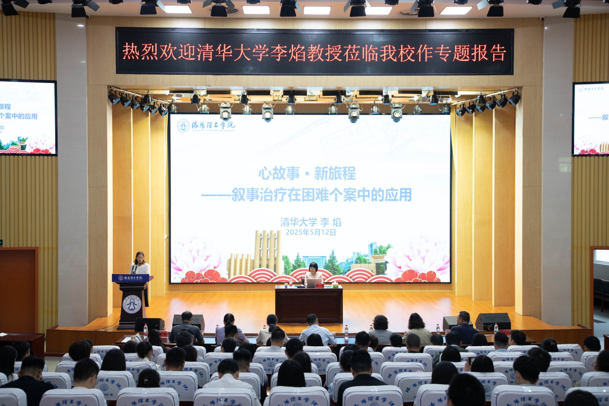 5月12日上午,清华大学学生心理发展指导中心首席专家李焰教授受邀在我校王城校区图书信息中心报告厅作题为《心故事·新形势——叙事疗法在理解高校困难个案的运用》专题报告。党委副书记胡恩立,学生工作处、校工会、校团委、马克思主义学院、心理健康教育中心、各一站式学生社区负责人,各二级学院党委副书记、全体辅导员、班主任和女工委员代表参加此次报告会。