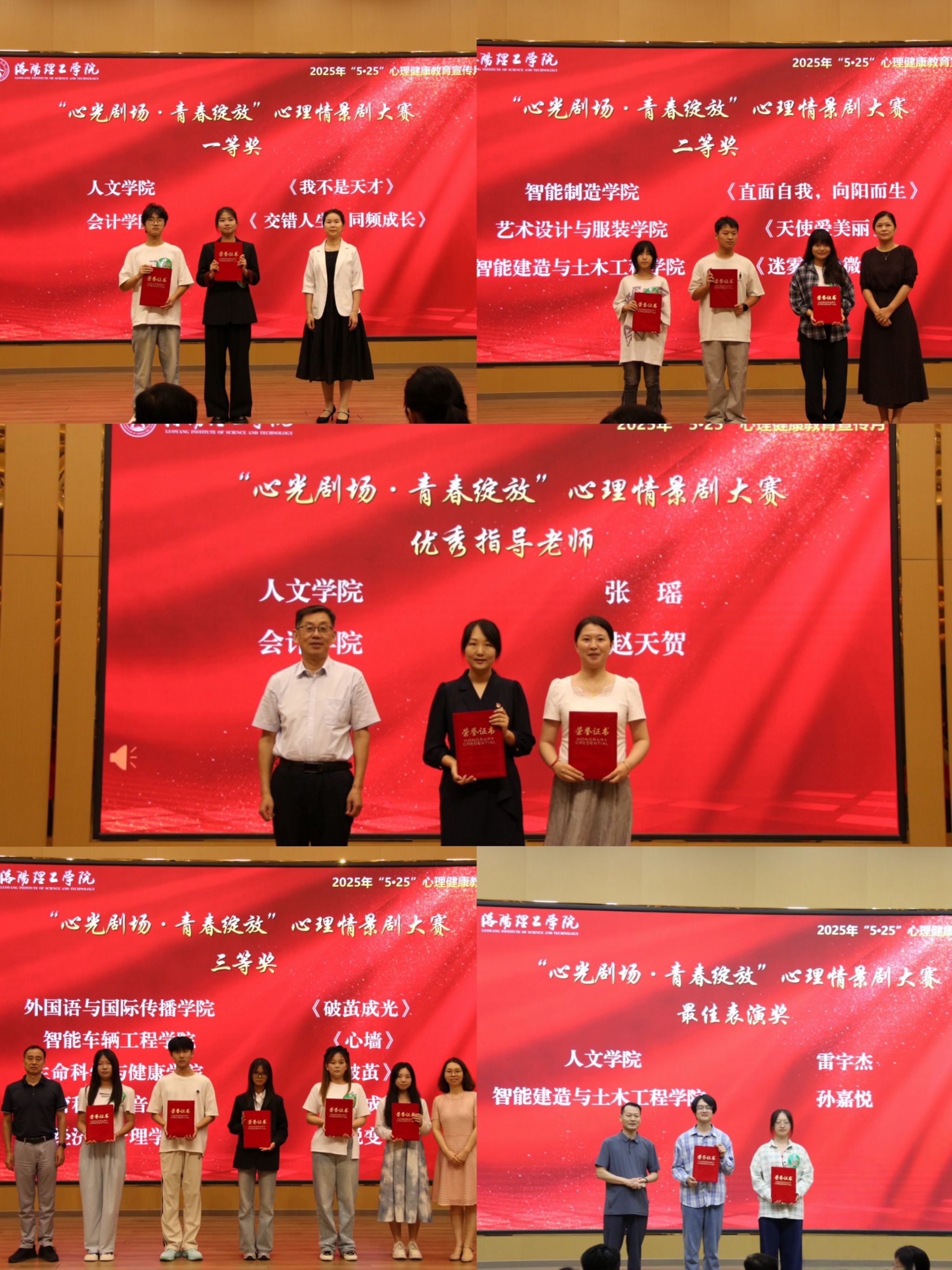 经学院初赛、全校复赛,共有10支队伍入围决赛。经过激烈角逐,人文学院《我不是天才》、会计学院《交错人生,同频成长》荣获一等奖,智能制造学院《直面自我,向阳而生》、艺术设计与服装学院《天使爱美丽》、智能建造与土木工程学院《迷雾中的微光》获二等奖,外国语与国际传播学院《破茧成光》、智能车辆工程学院《心墙》、生命科学与健康工程学院《破茧》、教育科学与音乐学院《皱纸成蝶》、经济与管理学院《蜕变》获三等奖;人文学院张瑶、会计学院赵天贺被评为优秀指导老师;人文学院雷宇杰、智能建造与土木工程学院孙嘉悦2名同学获最佳表演奖。