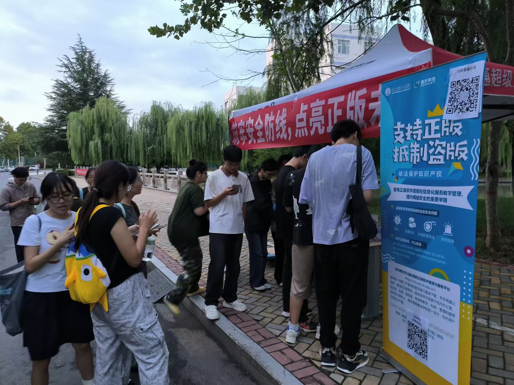 9月16日中午和傍晚,活动现场分别在王城校区铭苑一餐厅东门和开元校区太学广场开展。现场设置了宣传展板、 400份知识手册、答题指引和奖品发放点,吸引了众多师生驻足参与。参与者只需关注“洛理信息化”微信公众号,扫描答题二维码即可在线参与竞答。活动根据答题得分,实时反馈竞赛情况和抽取奖品,激发了师生的学习热情。