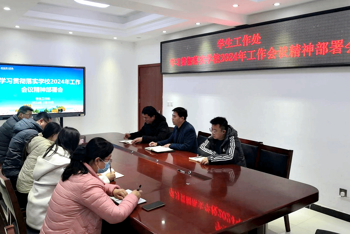 学生工作处 2月29日下午,学生工作处在大学生服务中心106会议室召开学习贯彻落实学校2024工作会议精神部署会。会议强调:一要统筹做好学生安全稳定工作,为本科审核评估,硕士授权单位建设等重点工作做好支撑配合。二积极主动担当作为,服务学生成长成才,努力构建“三全育人”聚合力的学生管理服务生态体系。三提高政治站位,高质量完成各项学生工作。会议要求全体同志认真学习贯彻好2024年学校会议精神,统一思想,凝聚共识,从学校事业发展全局和战略全局的高度认识学生工作的重要性,以更饱满的热情、更积极的态度迎接2024年新学期的各项工作,确保各项学生工作高效有序开展。